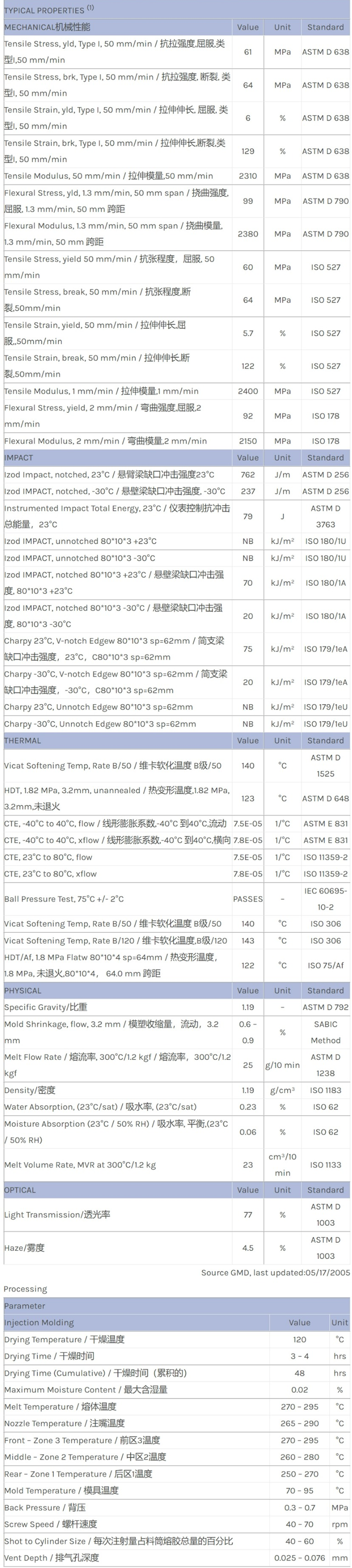 应用范围:产品描述LEXAN PC HPM1914物性表High flow specialty polycarbonate with enhanced hemocompatability. For medical devices and pharmaceutical applications. Healthcare management of change, biocompatible (ISO10993
