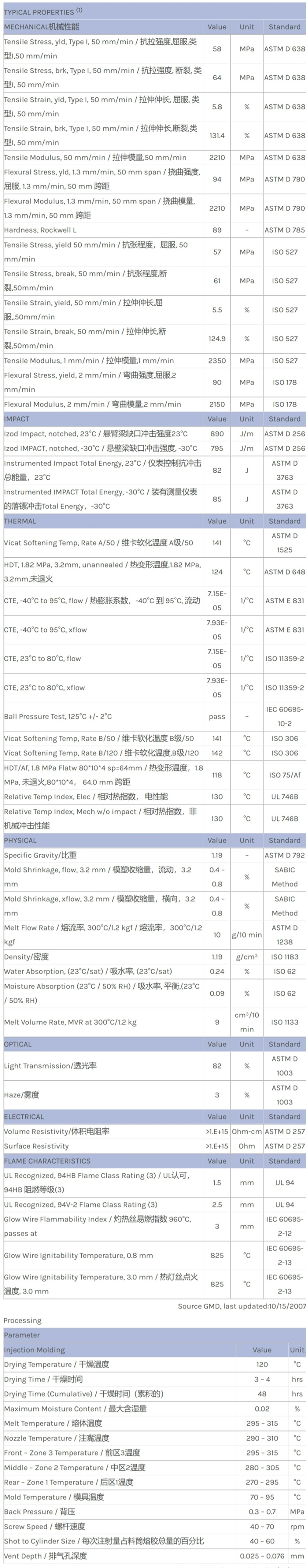 应用范围:产品描述LEXAN PC HPX4EU物性表Medium flow specialty polycarbonate – improved processability & autoclavability. For medical devices and pharmaceutical applications. Healthcare management of change, biocompatib