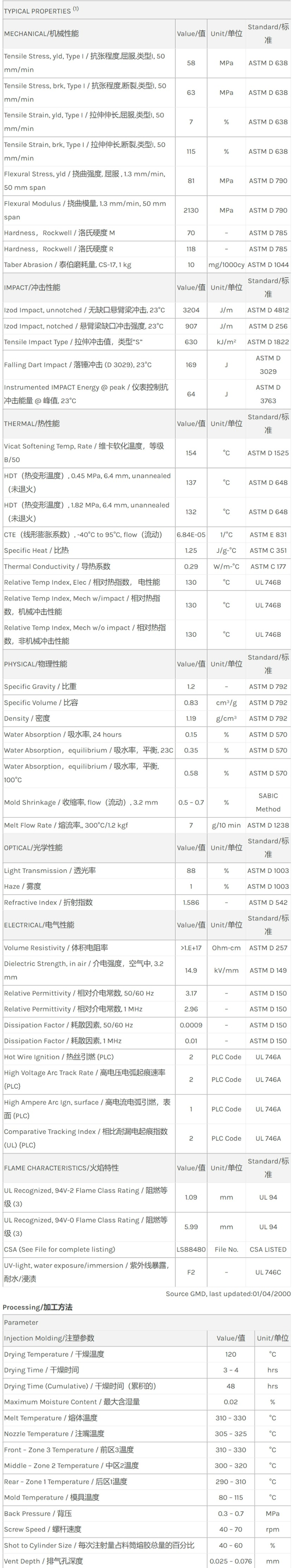 Lexan PC 201物性表