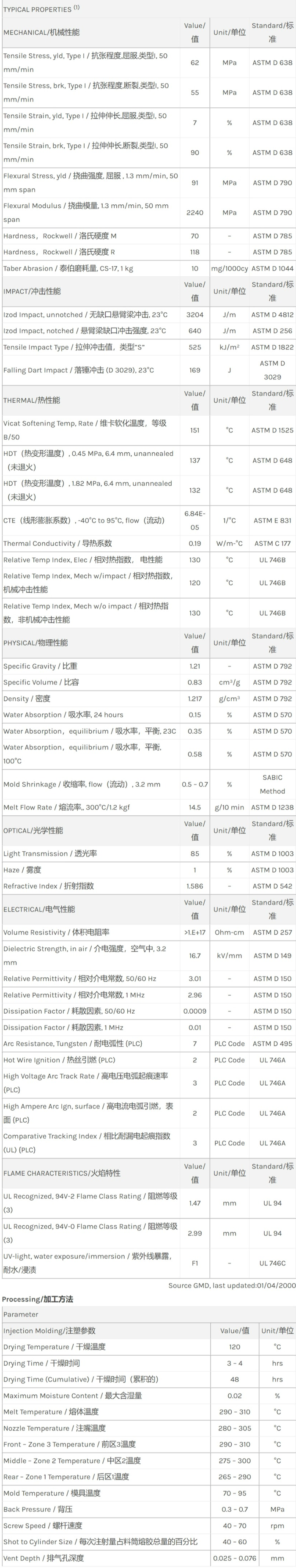 应用范围:产品描述Lexan PC 923A物性表“Lexan 923A resin是一种聚碳酸酯(PC)产品,它可以通过注射成型进行加工,典型应用领域为:户外应用。特性包括:阻燃/额定火焰Flame Retardant低粘度美观紫外线稳定”。相关颜色色号:923A-OR5E115、923A-BL6C017T、923A-116、923A-71257、923A-110、923A-RD1G006TLow vis