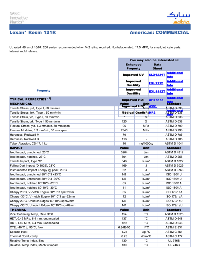 应用范围:产品描述Lexan PC 121R物性表非卤化。熔体流动速率MFR:17.5。用于注塑形状复杂的小型制件。相关颜色色号:121R-WH3A022X,121R-111、121R-701、121R-GY1D201T、121R-RD4D075、121R-1111、121R-21051、121R-GN7D080T、121R-8A9D026、121R-BL2D019T、121R-GY9B278、121R-7