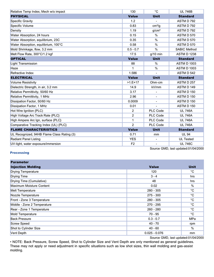 UL rated HB as of 10/97. 200 series recommended when V-2 rating required. Nonhalogenated. 17.5 MFR, for small, intricate parts. Internal mold release.
