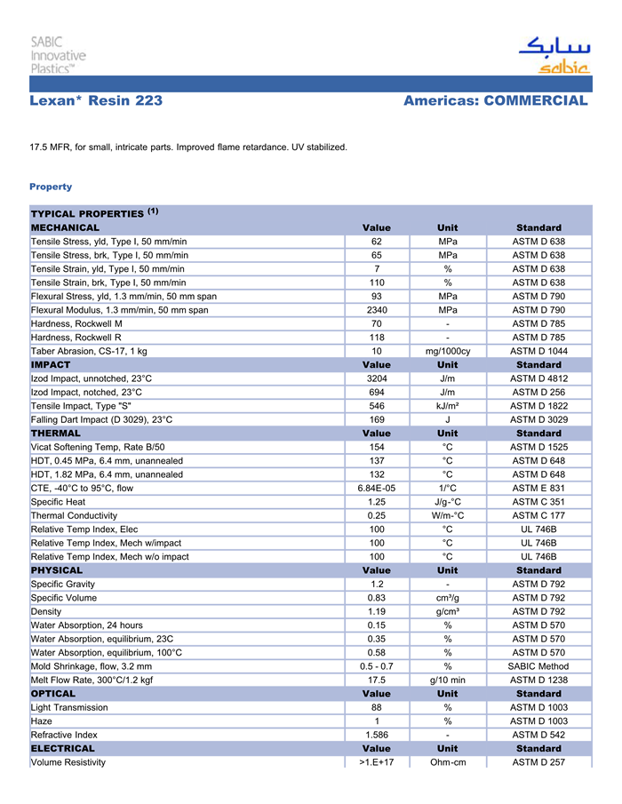 应用范围:产品描述LEXAN PC 223物性表熔体流动速率MFR:17.5。用于注塑小型、复杂制件。改良的阻燃性能。 紫外稳定。相关色号:223-111