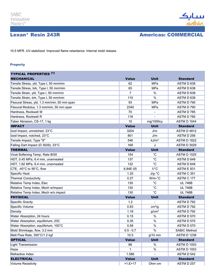 Lexan PC 243R物性表