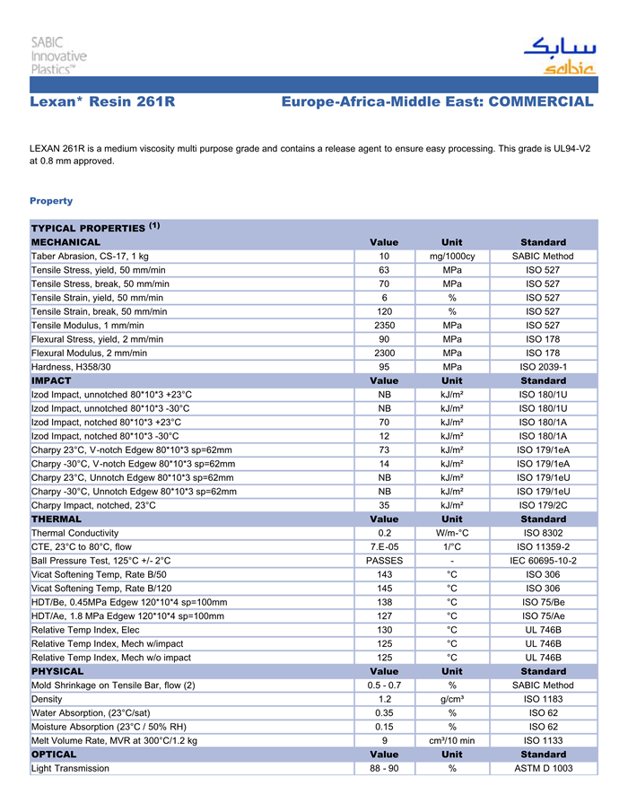 LEXAN 261R is a medium viscosity multi purpose grade and contains a release agent to ensure easy processing. This grade is UL94-V2 at 0.8 mm approved.