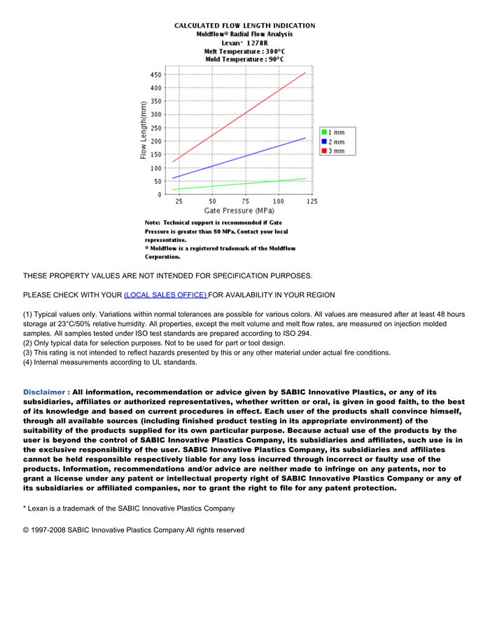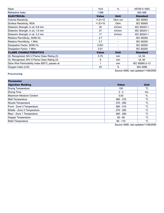 应用范围:产品描述Lexan PC 261R物性表“Lexan 261R resin是一种聚碳酸酯(PC)材料,加工方式为:注射成型。主要特性有:阻燃/额定火焰通过 ROHS 认证加工性能良好脱模剂中等粘度”。相关颜色色号:261R-GY1574、261R-111LEXAN 261R is a medium viscosity multi purpose grade and contains a relea