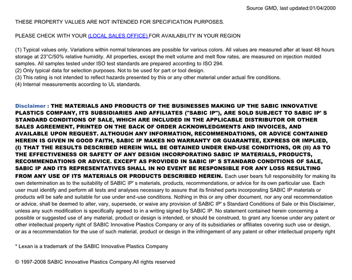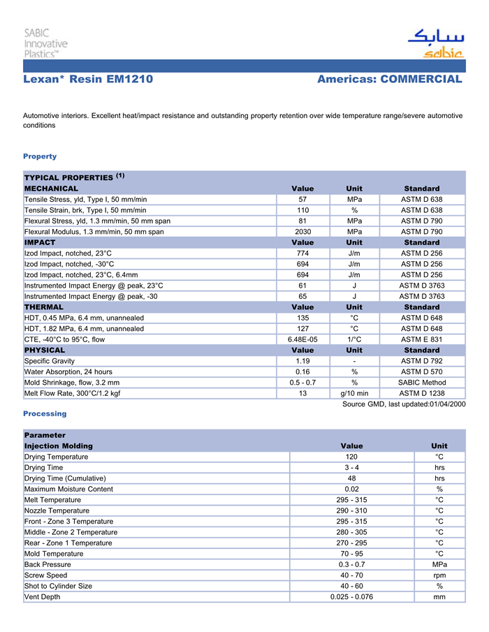 Lexan PC EM1210物性表