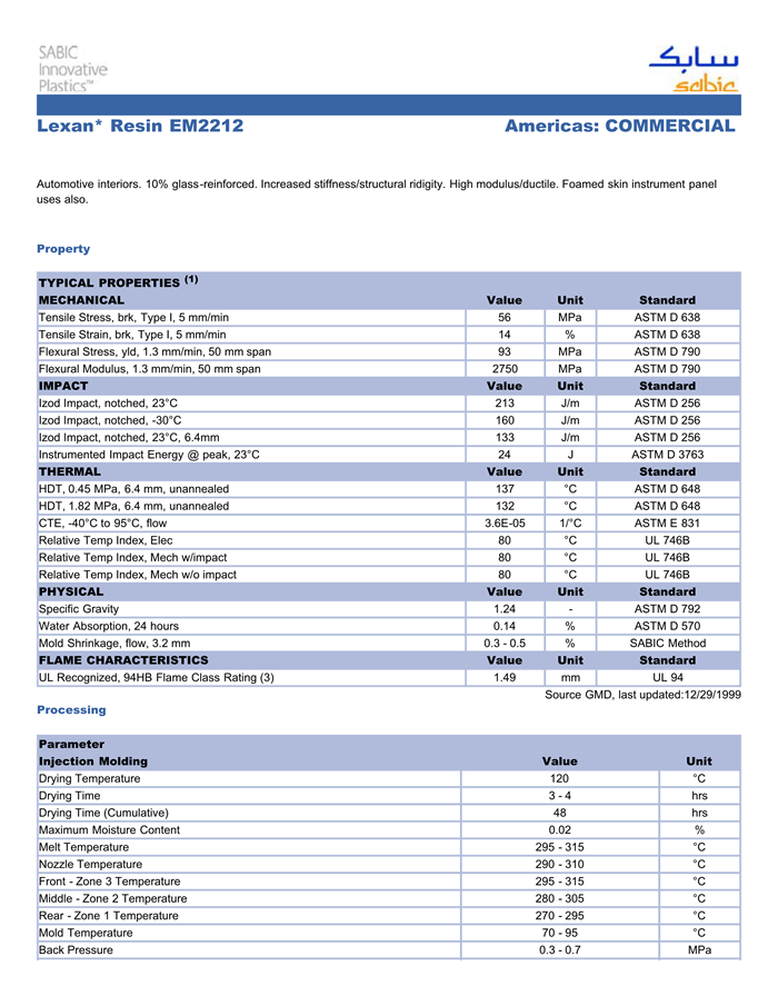 应用范围:产品描述Lexan PC EM2212物性表汽车内部件。10% 玻璃纤维增强。改良的劲度、结构刚度。高模量、高延性。也可用于泡沫塑料面层仪表板。Automotive interiors. 10% glass-reinforced. Increased stiffness/structural ridigity. High modulus/ductile. Foamed skin instrumen
