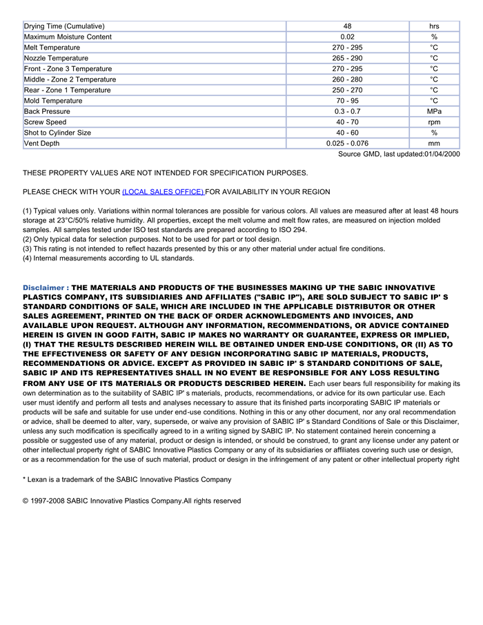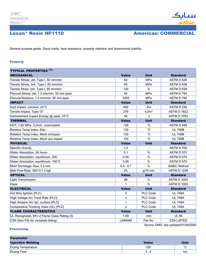 Lexan PC HF1110物性表