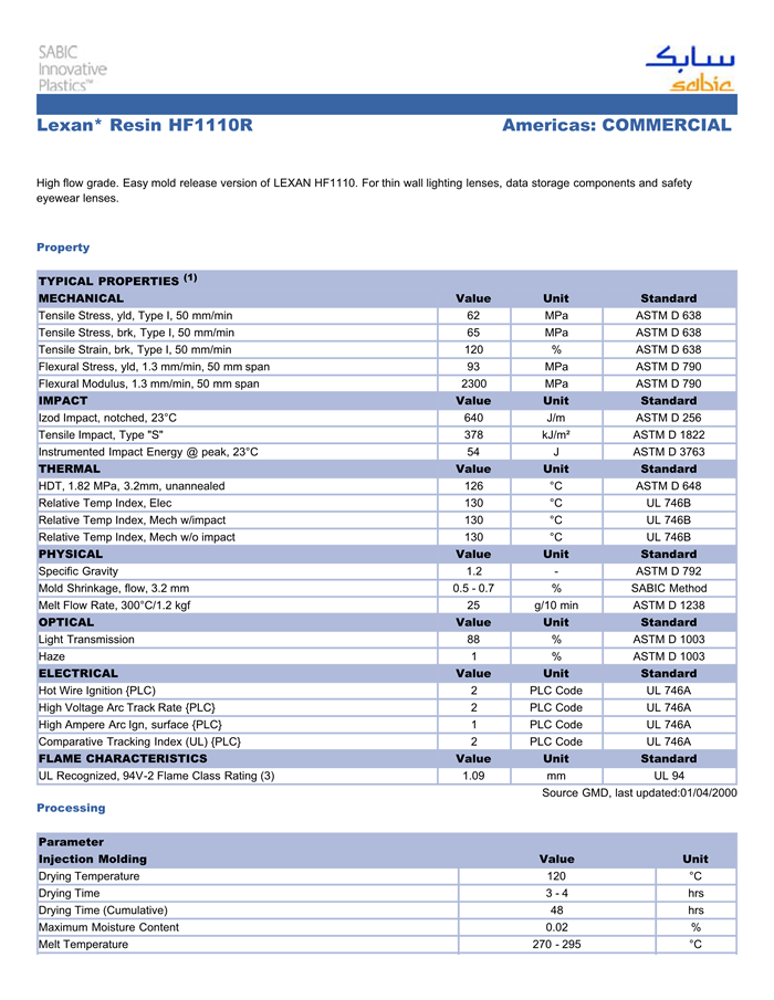 High flow grade. Easy mold release version of LEXAN HF1110. For thin wall lighting lenses, data storage components and safety eyewear lenses.