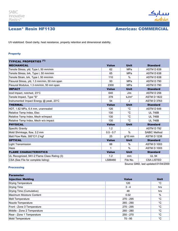 应用范围:产品描述Lexan PC HF1130物性表紫外稳定。 良好的清晰度、耐热性、性能保留性、尺寸稳定性。相关颜色色号:HF1130-BK1C098、HF1130-111、HF1130-WH8414、HF1130-701、HF1130-GY8D318、HF1130-1111、HF1130-GY4562T、HF1130-BL3230、HF1130-GY5D566T、HF1130-BK1B054X、HF1