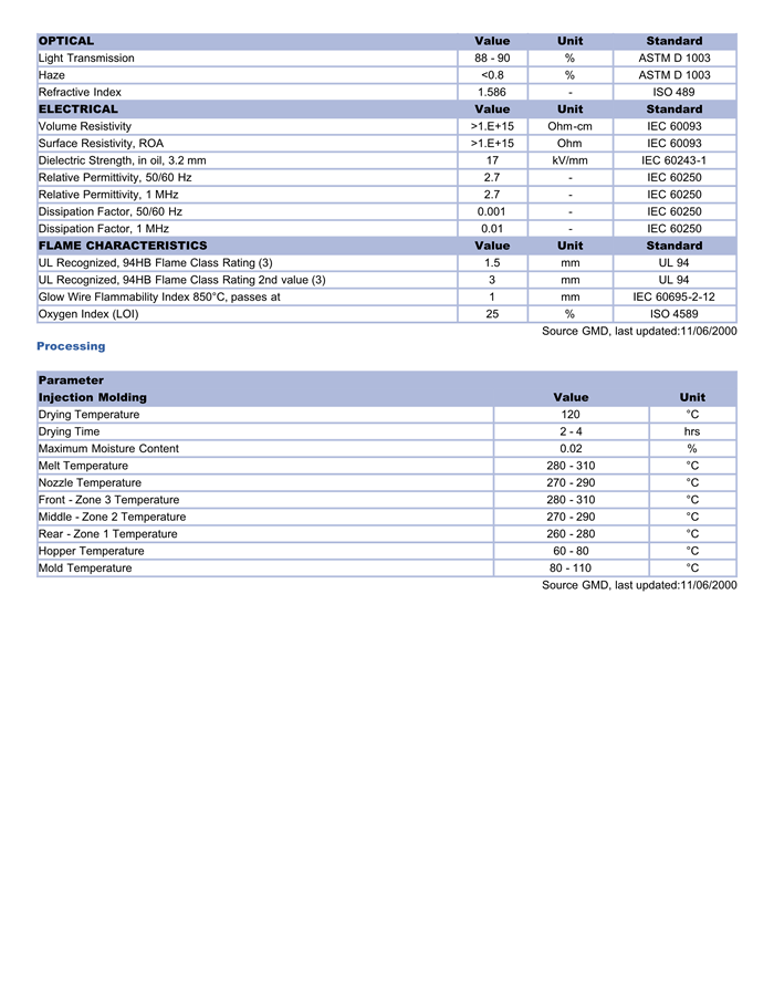 应用范围:产品描述Lexan PC 164R物性表“Lexan 164R resin是一种聚碳酸酯(PC)材料,加工方式为:注射成型。主要特性有:阻燃/额定火焰通过 ROHS 认证可接触食品脱模剂中等粘度Lexan 164R resin的典型应用领域为:食品接触应用”。相关颜色色号:164R-111FC、164R-GY81001TMedium viscosity, multi purpose polycar
