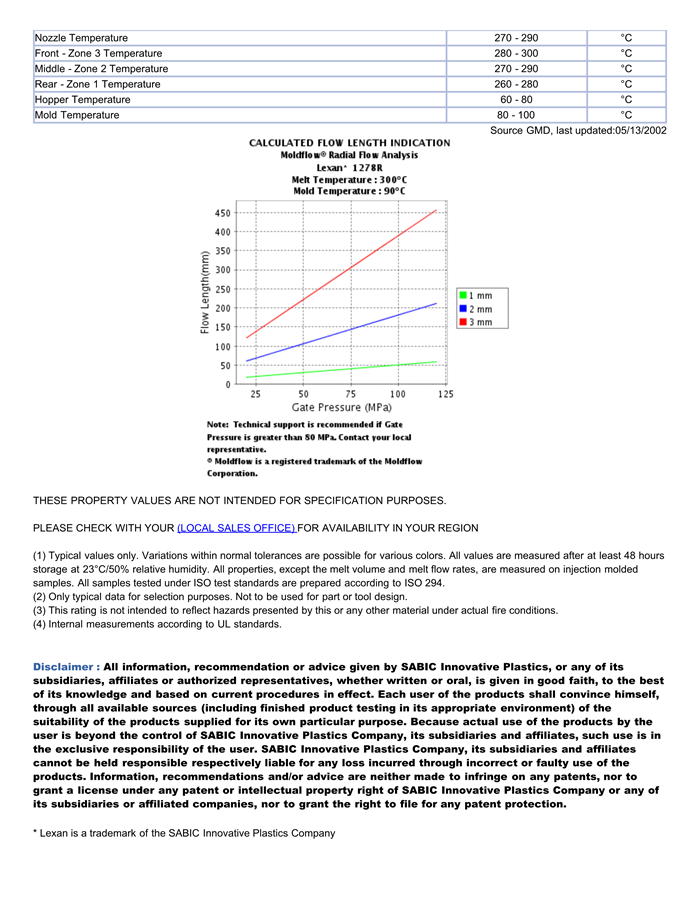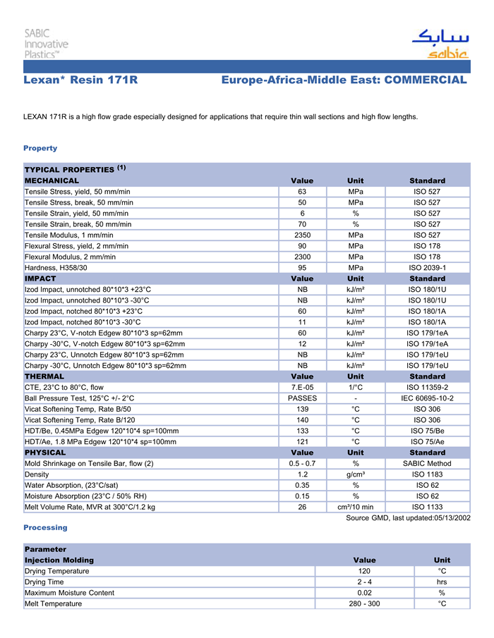 应用范围:产品描述LEXAN PC 171R物性表LEXAN 171R is a high flow grade especially designed for applications that require thin wall sections and high flow lengths.