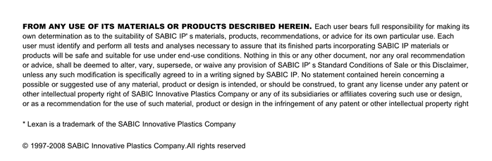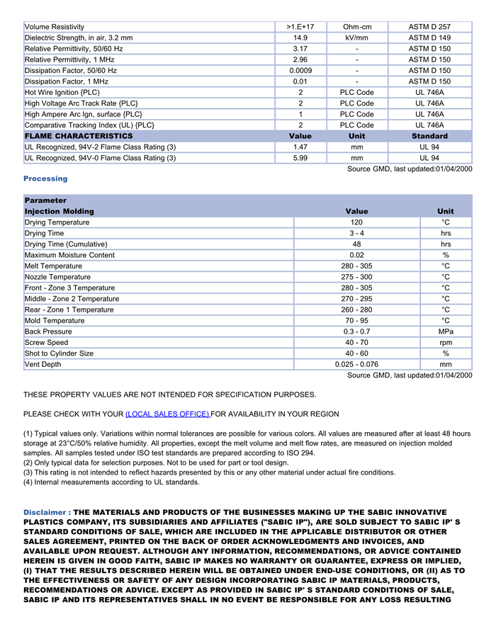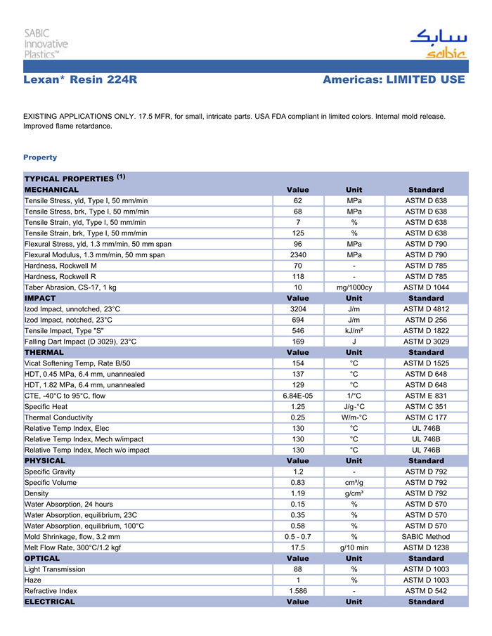 应用范围:产品描述LEXAN PC 224R物性表EXISTING APPLICATIONS ONLY. 17.5 MFR, for small, intricate parts. USA FDA compliant in limited colors. Internal mold release. Improved flame retardance.