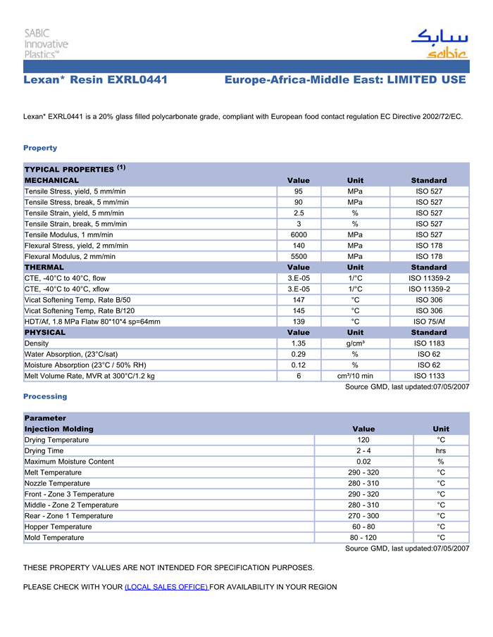 Lexan* EXRL0441 is a 20% glass filled polycarbonate grade, compliant with European food contact regulation EC Directive 2002/72/EC.
