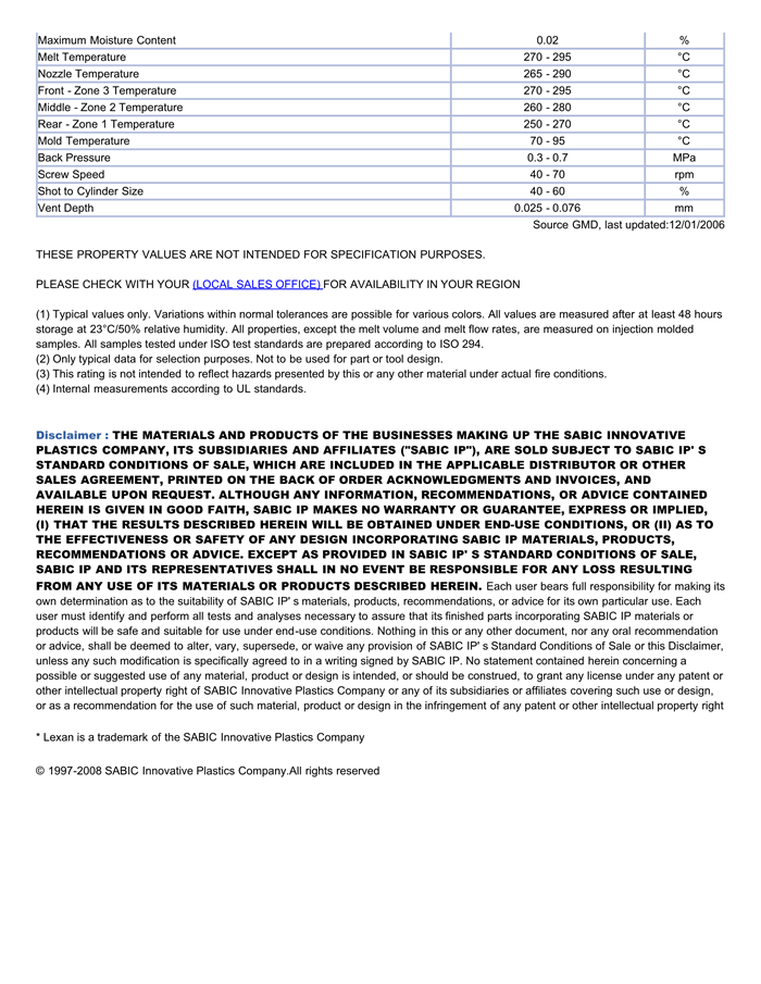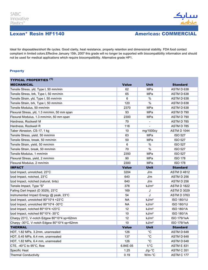 应用范围:产品描述Lexan PC HF1140物性表FDA 可承认。易处理、短使用周期物品的理想原料。 良好的清晰度、耐热性、性能保留性、尺寸稳定性。相关颜色色号:HF1140-111FC、HF1140-701Ideal for disposables/short life cycles. Good clarity, heat resistance, property retention and dime