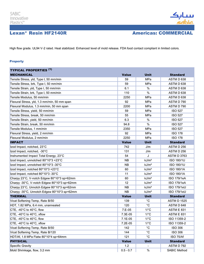 应用范围:产品描述LEXAN PC HF2140R物性表High flow grade. UL94 V-2 rated. Heat stabilized. Enhanced level of mold release. FDA food contact compliant in limited colors.