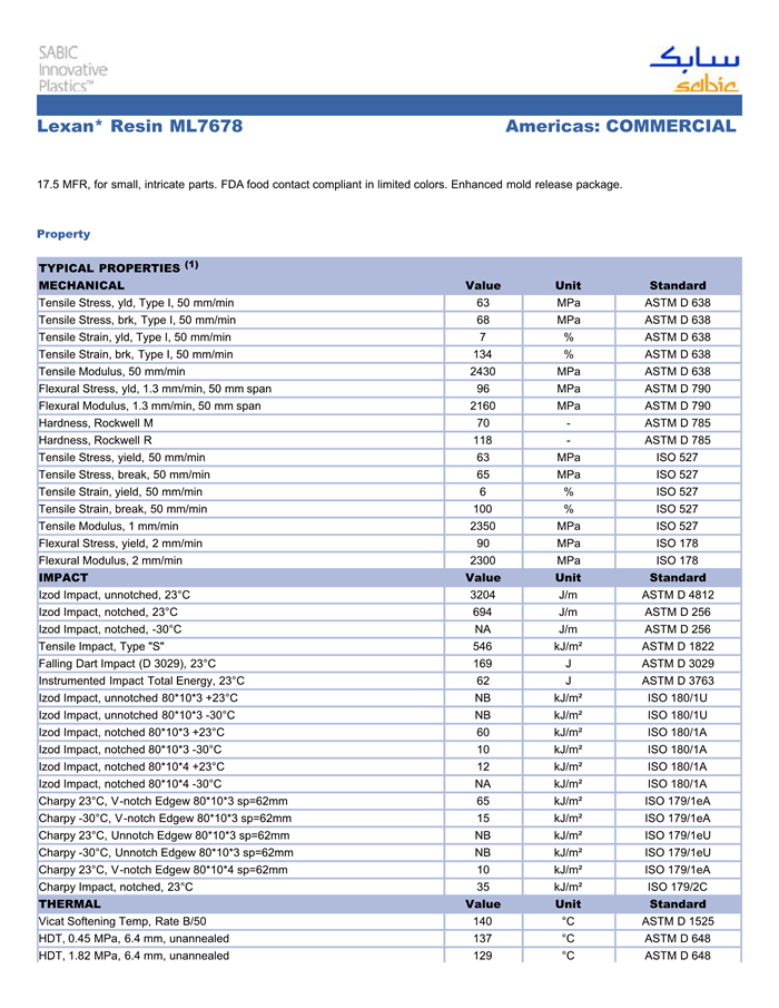 应用范围:产品描述LEXAN PC ML7678物性表17.5 MFR, for small, intricate parts. FDA food contact compliant in limited colors. Enhanced mold release package.