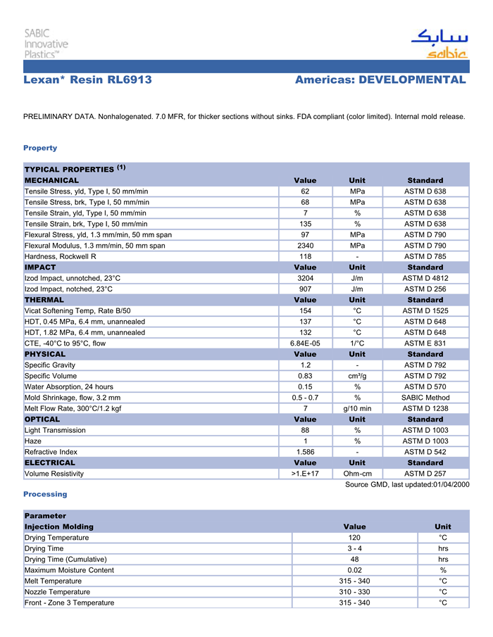 应用范围:产品描述LEXAN PC RL6913物性表PRELIMINARY DATA. Nonhalogenated. 7.0 MFR, for thicker sections without sinks. FDA compliant (color limited). Internal mold release.
