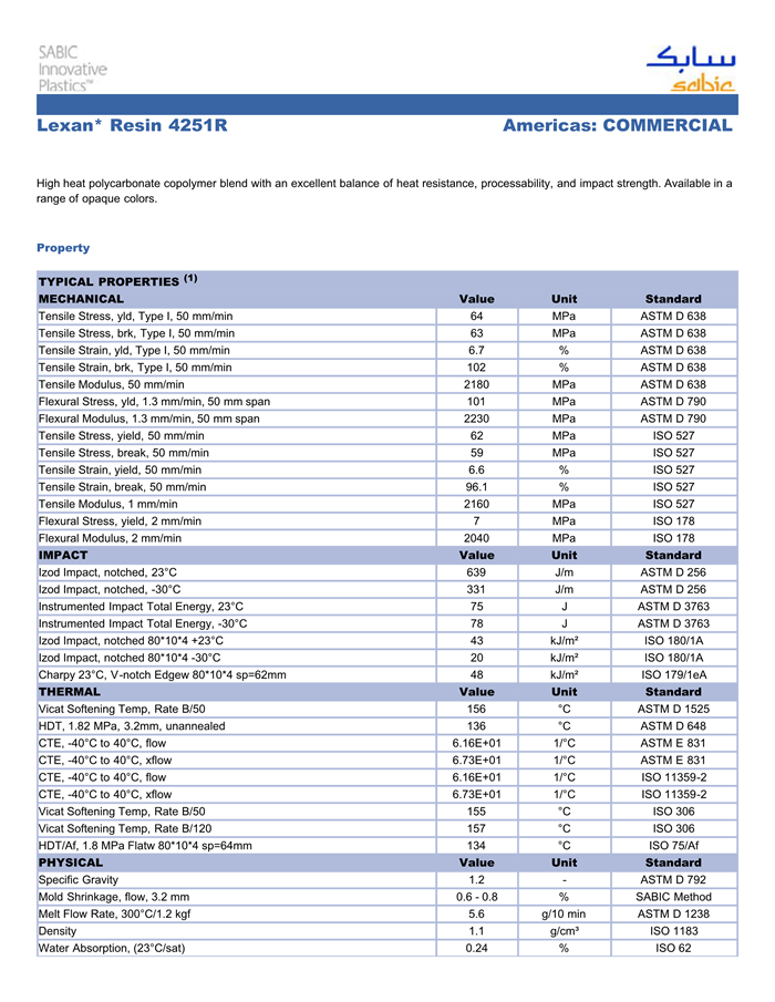 应用范围:产品描述Lexan PC 4251R物性表“Lexan 4251R resin是一种聚碳酸脂 + PPC (PC+PPC)产品,它可以通过注射成型进行加工。特性包括:共聚物加工性能良好耐冲击耐热”High heat polycarbonate copolymer blend with an excellent balance of heat resistance, processability,