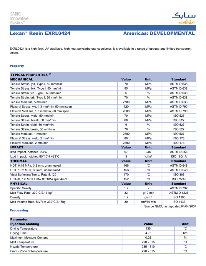 应用范围:产品描述LEXAN PC EXRL0424物性表EXRL0424 is a high flow, UV stabilized, high heat polycarbonate copolymer. It is available in a range of opaque and limited transparent colors.
