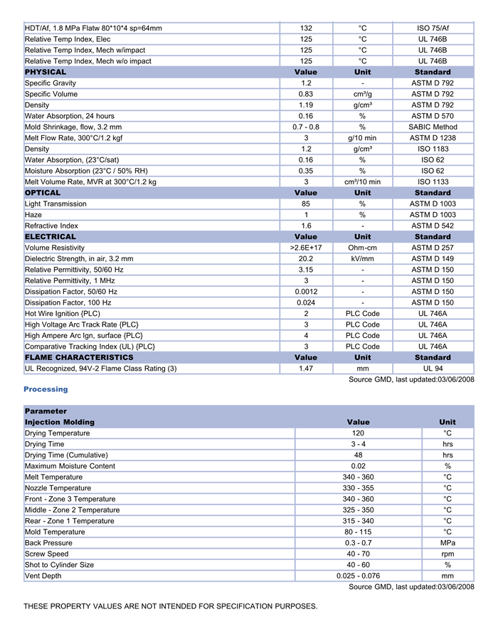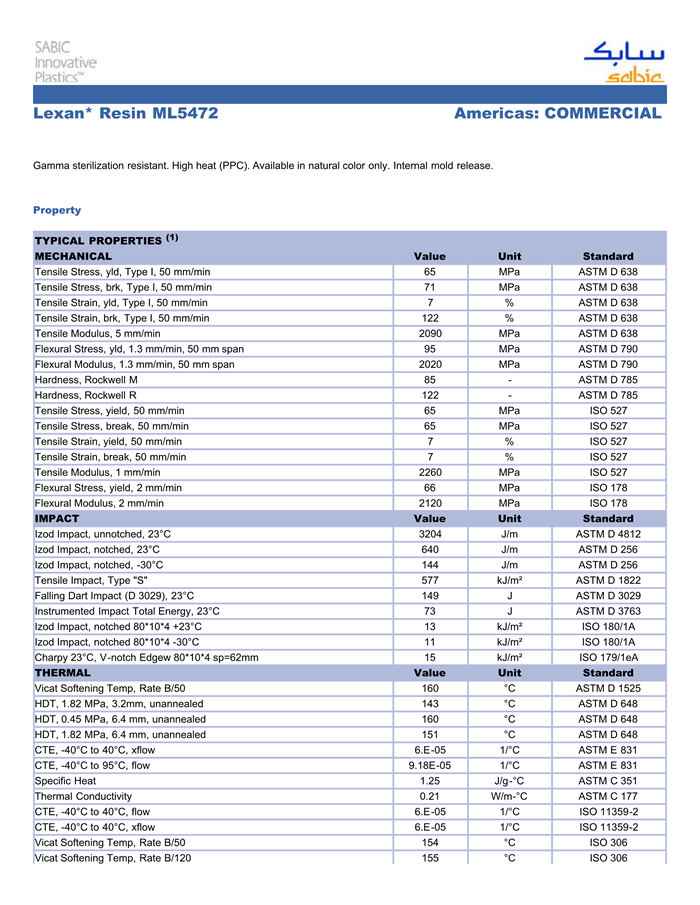 应用范围:产品描述LEXAN PC ML5472物性表Gamma sterilization resistant. High heat (PPC). Available in natural color only. Internal mold release.