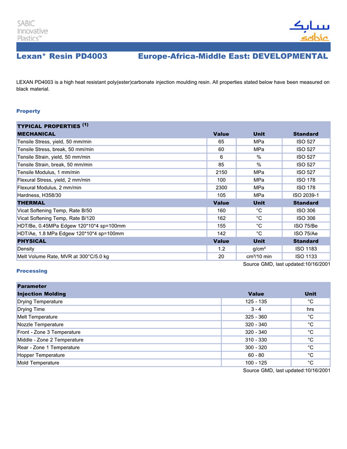 LEXAN PD4003 is a high heat resistant poly(ester)carbonate injection moulding resin. All properties stated below have been measured on black material.