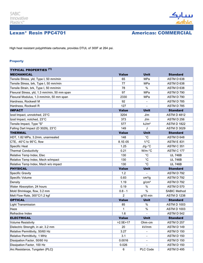 应用范围:产品描述LEXAN PC PPC4701物性表High heat resistant polyphthlate carbonate, provides DTUL of 300F at 264 psi.