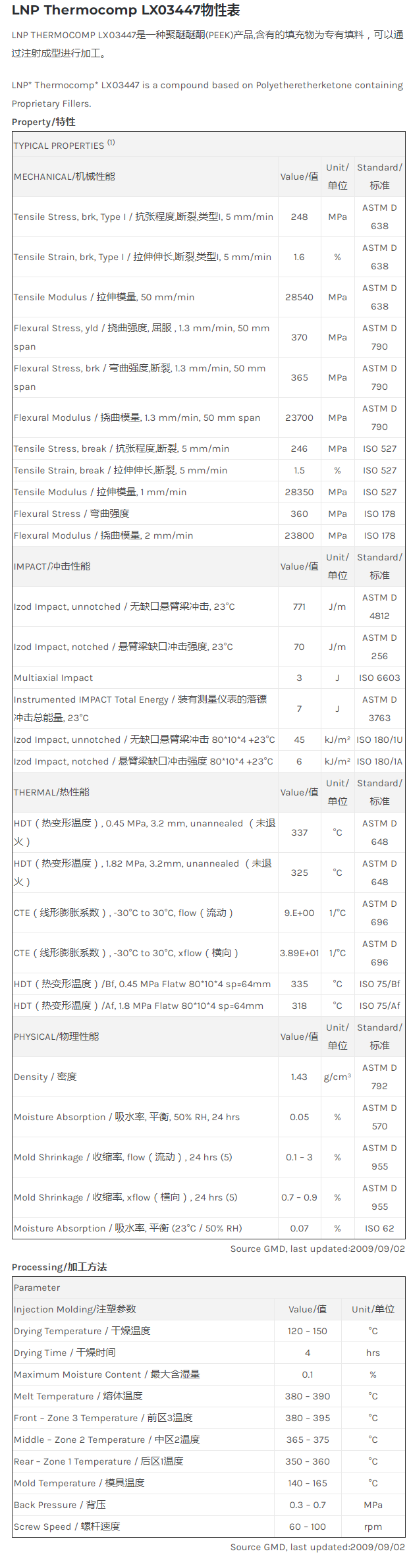 应用范围: 产品描述 LNP Thermocomp LX03447物性表 LNP THERMOCOMP LX03447是一种聚醚醚酮(PEEK)产品,含有的填充物为专有填料,可以通过注射成型进行加工。 LNP* Thermocomp* LX03447 is a compound based on Polyetheretherketone containing Proprietary Fillers.