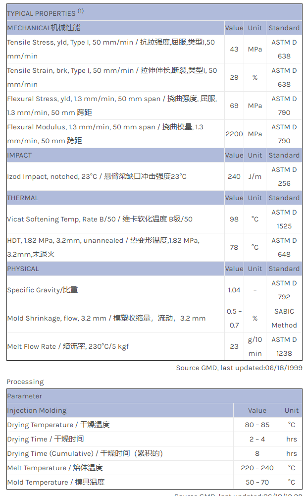 应用范围:产品描述CYCOLAC ABS AP95物性表High flow, medium IMPACT grade of ABS with improved ESCR performance.
