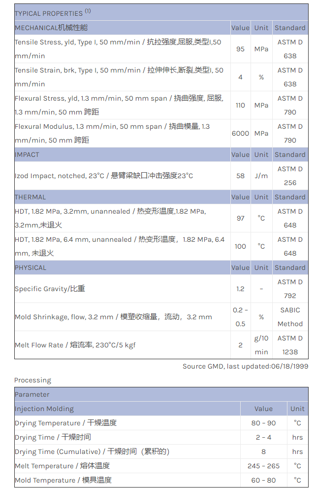 应用范围:产品描述CYCOLAC ABS AS200GF物性表ABS 20%玻璃纤维填充牌号