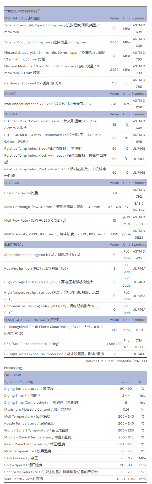 应用范围:产品描述CYCOLAC ABS GPM6300物性表GPM6300的特点:优异的色泽稳定性。较高的流动性。