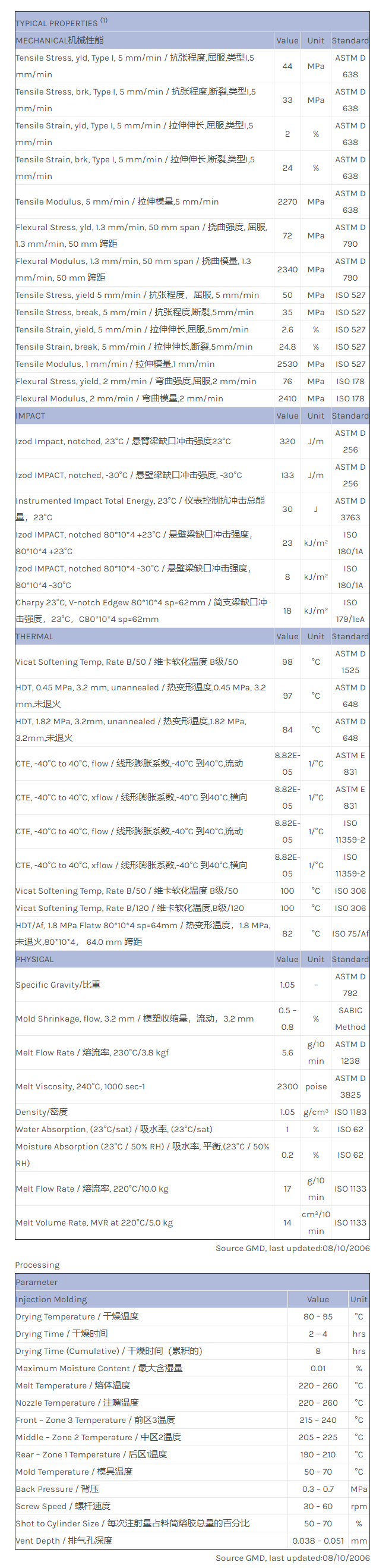 应用范围:产品描述CYCOLAC ABS MG47TG物性表Multi-purpose, injection molding ABS providing a favorable balance of engineering properties. Improved Tg.