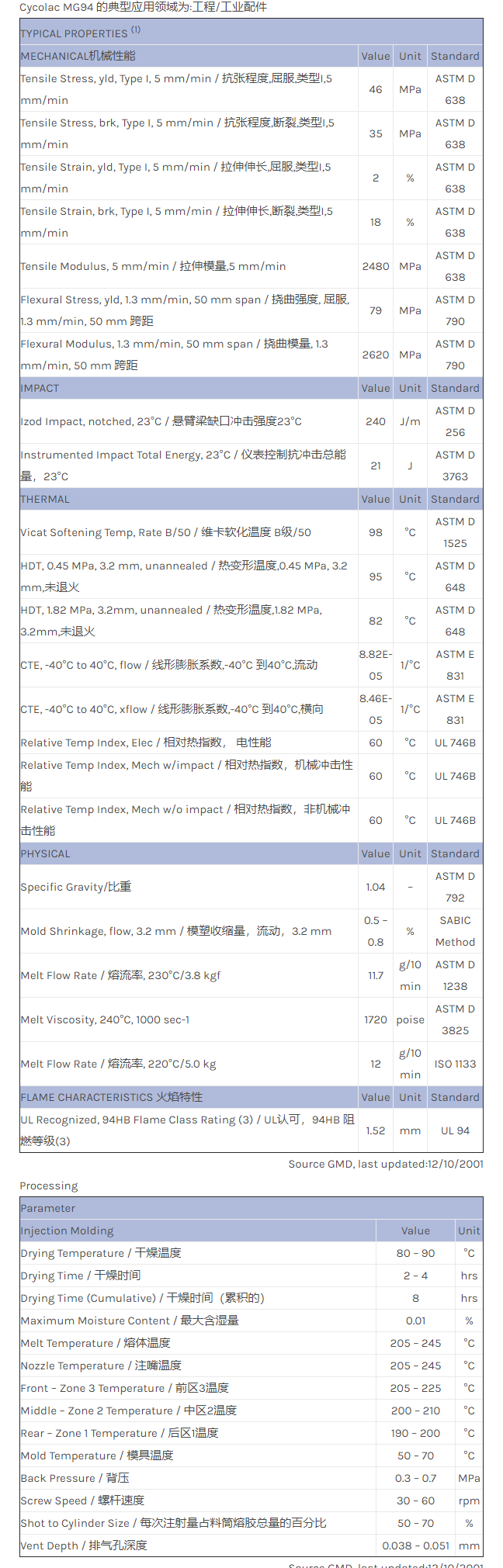 Cycolac MG94 是一种丙烯腈丁二烯苯乙烯(ABS)材料,加工方式为:注射成型。