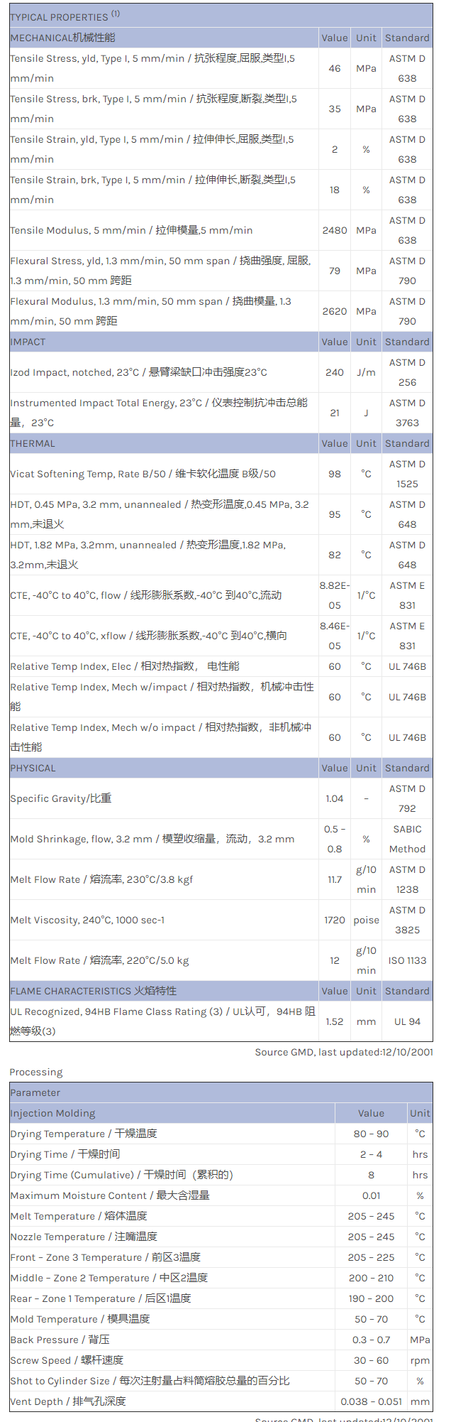 应用范围:产品描述CYCOLAC ABS MG94F物性表Cycolac MG94F 是一种丙烯腈丁二烯苯乙烯(ABS)材料,加工方式为:注射成型。Cycolac MG94F 的主要特性有:通过 ROHS 认证耐冲击典型应用领域包括:工程/工业配件食品接触应用