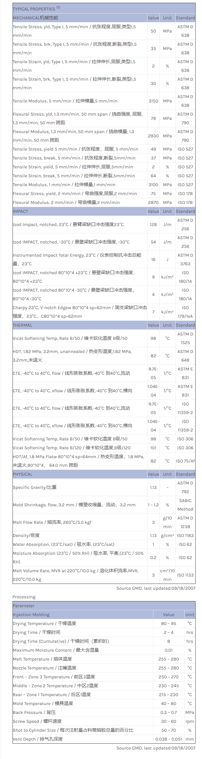 应用范围:产品描述CYCOLAC ABS XHMM1物性表High modulus blend with both good surface aesthetics and elongation.