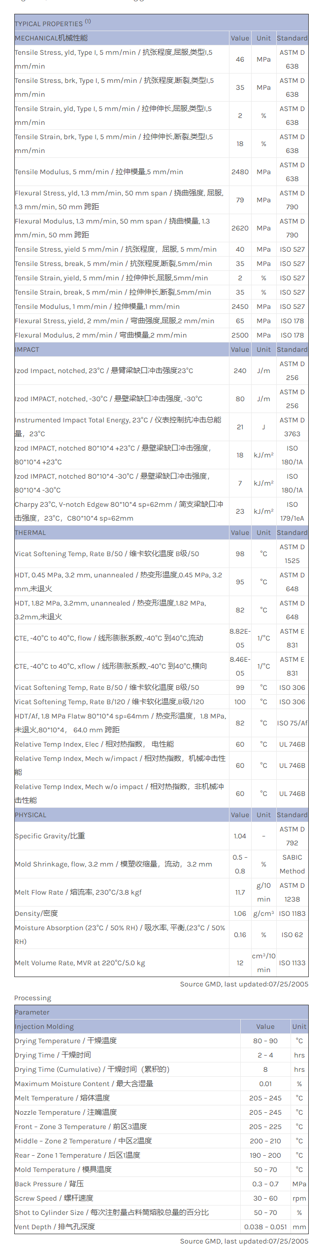 应用范围:产品描述CYCOLAC ABS XMG94U物性表High flow, UV stabilized ABS molding grade