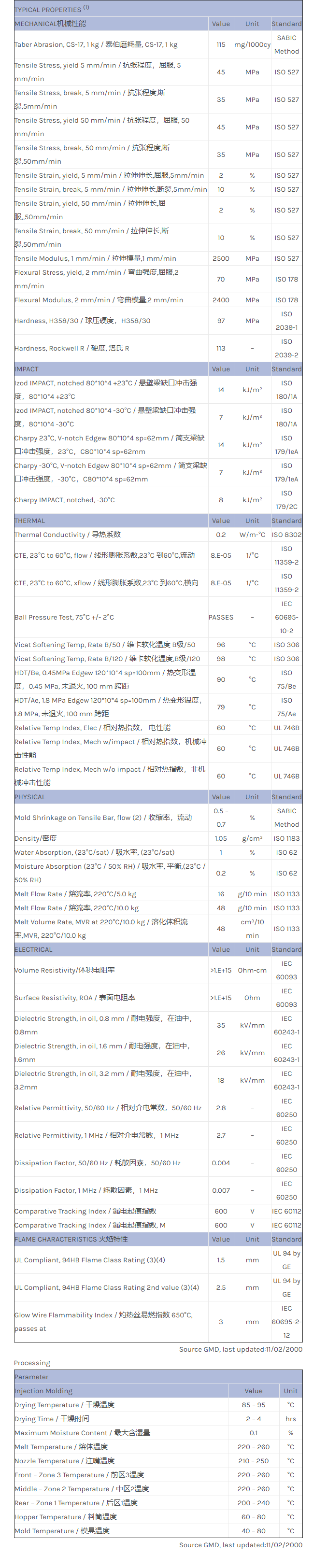 CYCOLAC ABS XS701S物性表