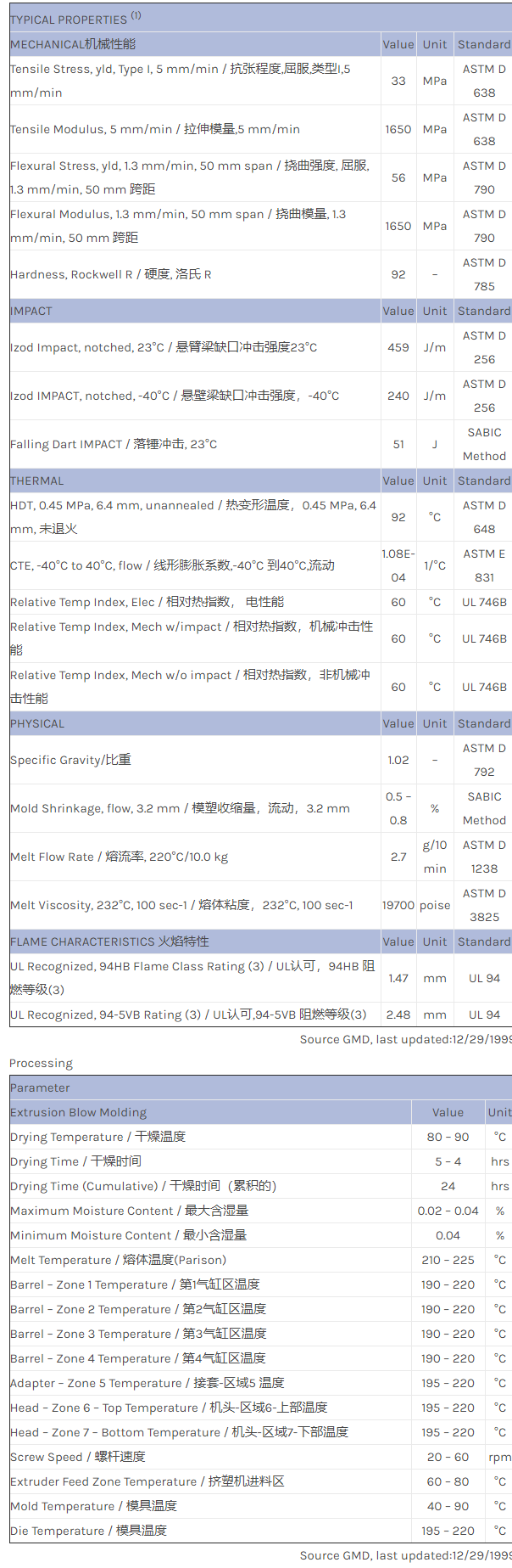 主要特性:中等流动性、超高抗冲击性、优异的熔体强度和再研磨稳定性、低温时韧性较高
