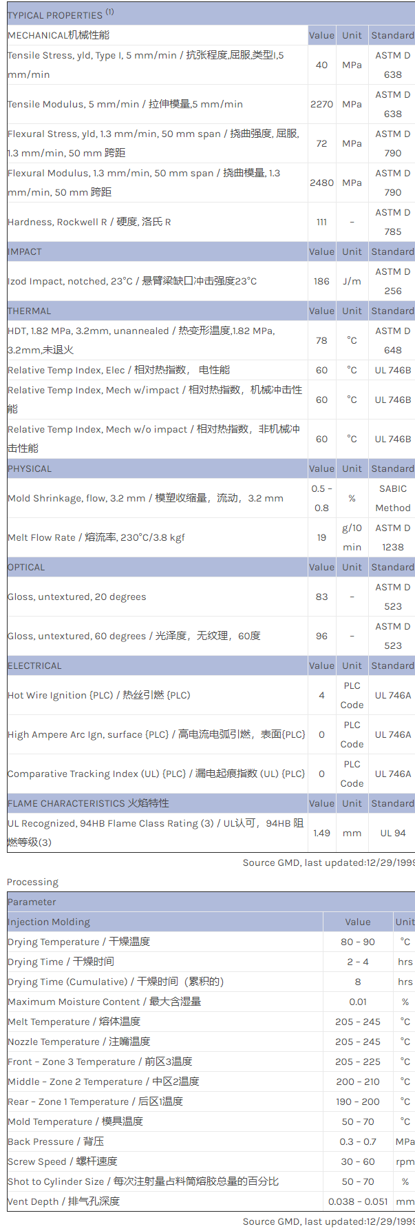 应用范围:产品描述CYCOLAC ABS GLC1物性表High flow, high modulus, high gloss and good colorability. For non-IMPACT critical parts.