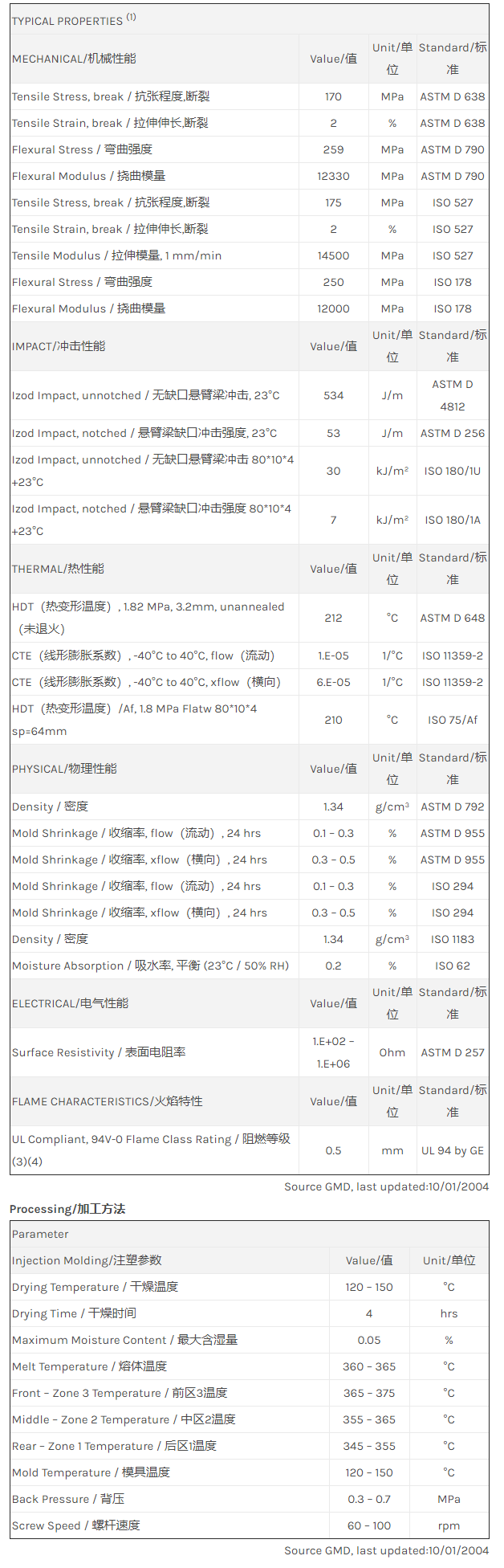 应用范围: 产品描述 LNP Thermocomp EC004XXC物性表 “LNP THERMOCOMP EC004XXC是一种聚醚酰亚胺(PEI)产品,含有的填充物为20%碳纤维增强材料,可以通过注射成型进行加工。 特性包括: 阻燃/额定火焰 传导性” LNP* Thermocomp* EC004XXC is a compound based on Polyetherimide resin