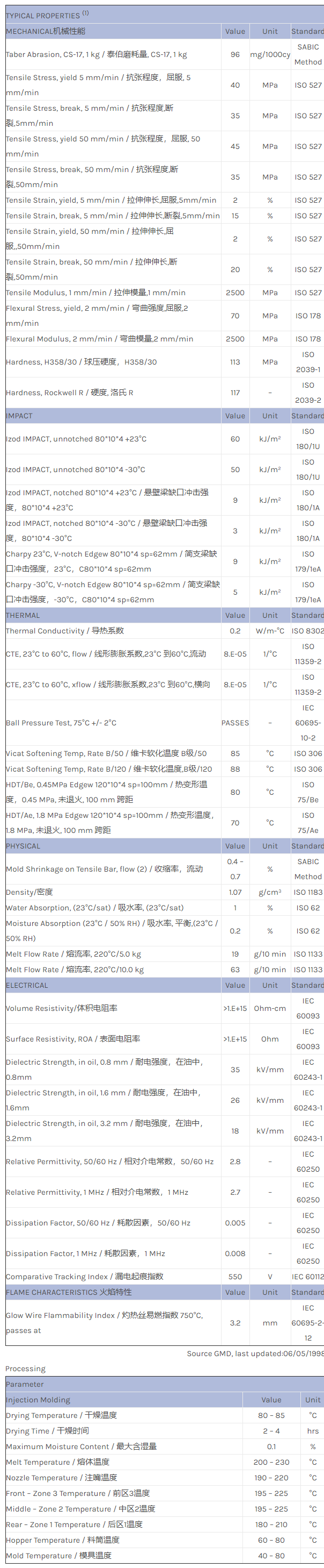 CYCOLAC ABS XS158物性表