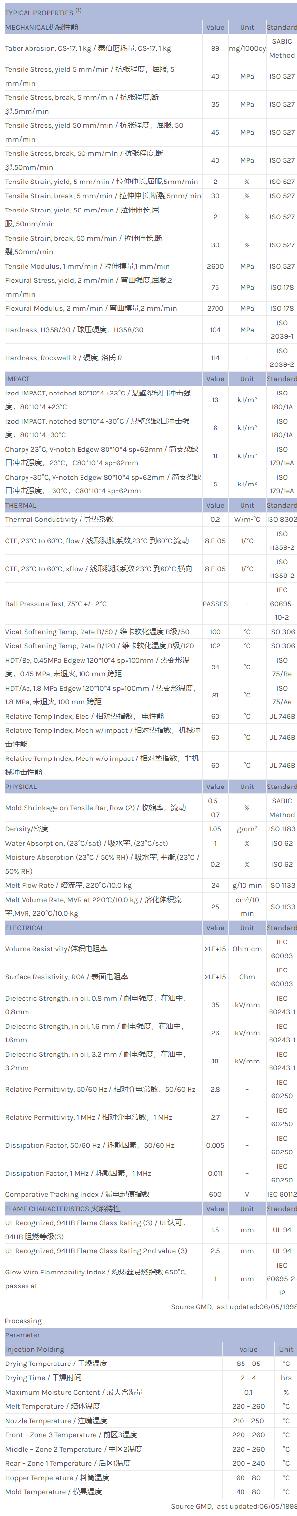 CYCOLAC ABS S704物性表