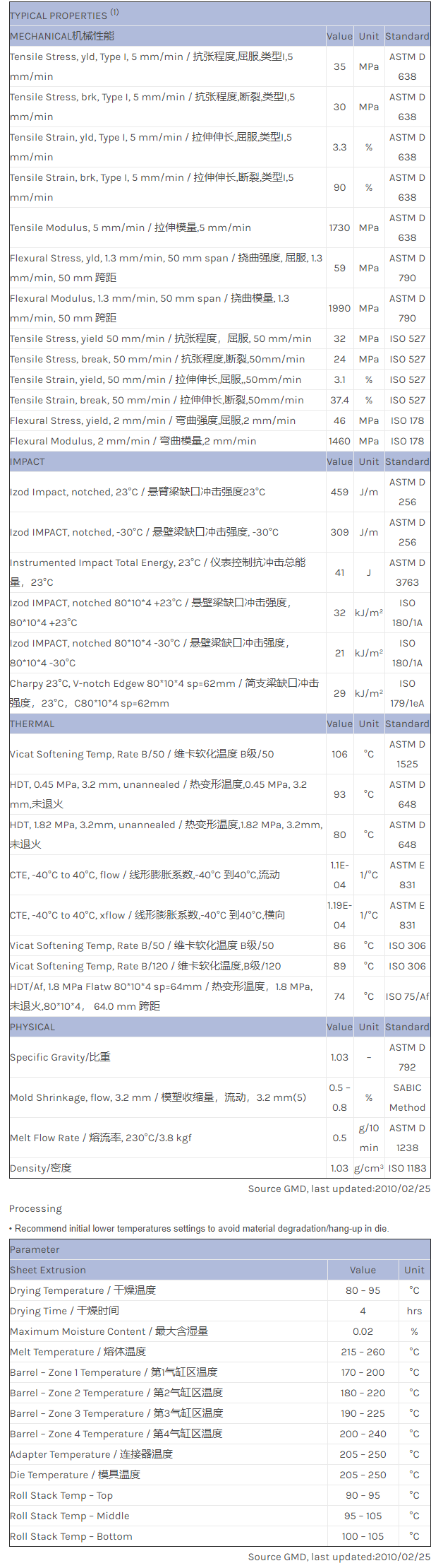 应用范围:产品描述CYCOLAC ABS EX39P物性表High IMPACT pipe extrusion ABS for drain, waste, and vent applications. Meets NSF/CSA cell class 42221