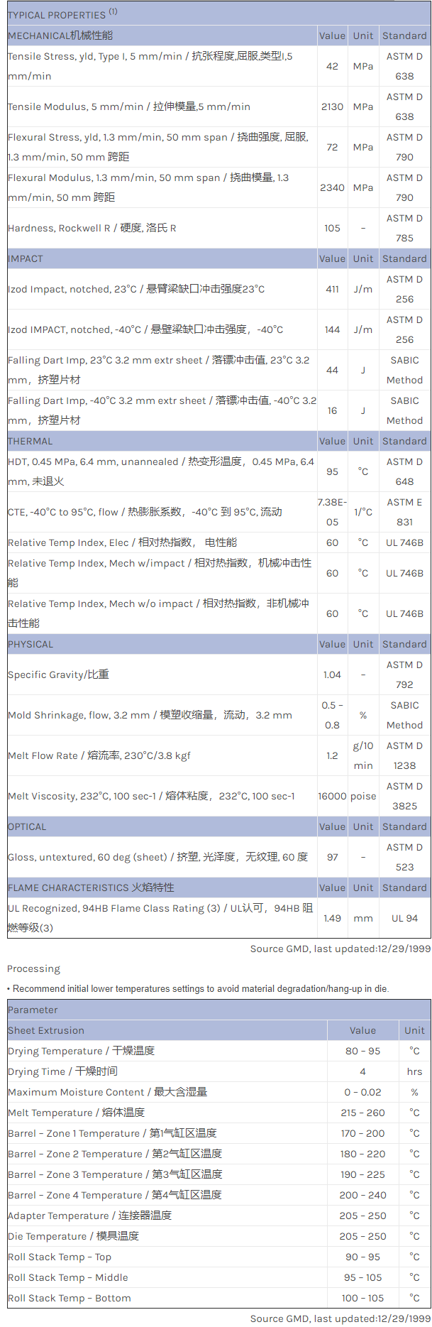 主要特点;高流动性、中等抗冲击性。优异的加工性能/片材美观。聚色应用良好。