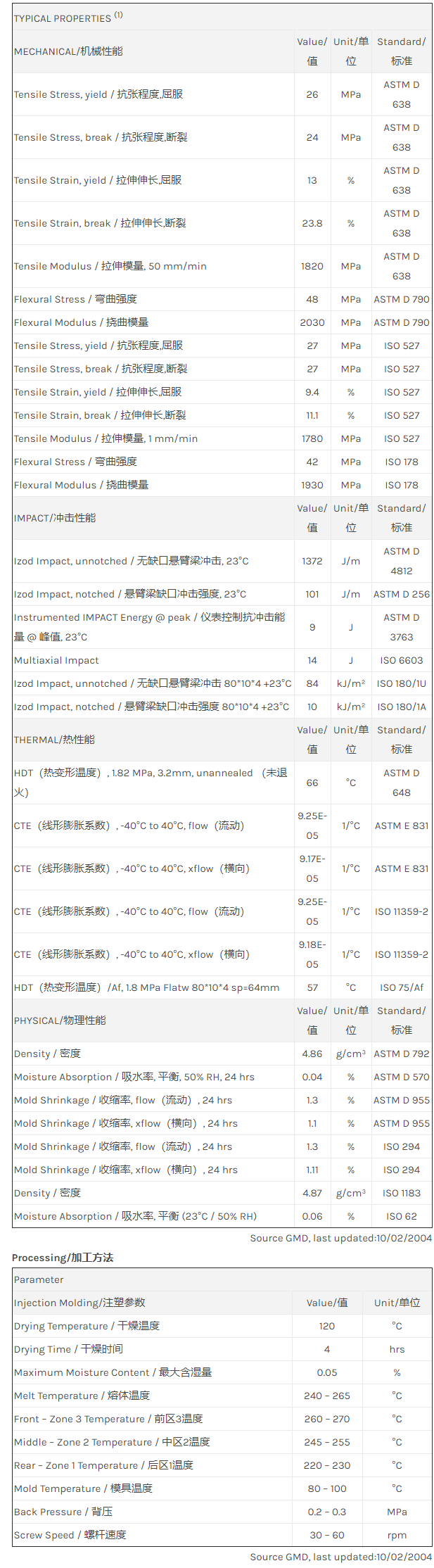 应用范围: 产品描述 LNP Thermocomp WX02869H物性表 “LNP THERMOCOMP WX02869H是一种热塑性聚酯产品,含有的填充物为专有填料,可以通过注射成型进行加工。 主要特性为:耐冲击。” LNP THERMOCOMP* WX02869H is a compound based on Polyester, TP resin containing High Speci