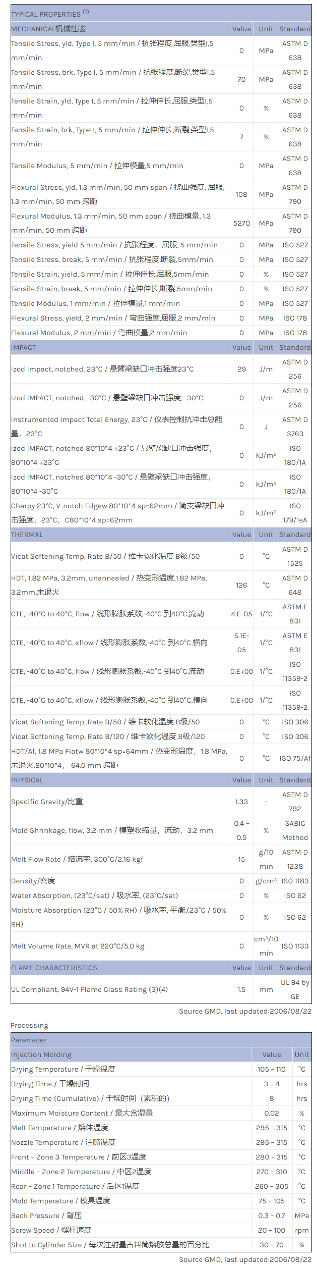 Modified PPO*, 30% mineral filled product, V-1@1.5mm, HDT 125degC, low warpage product, BK color only