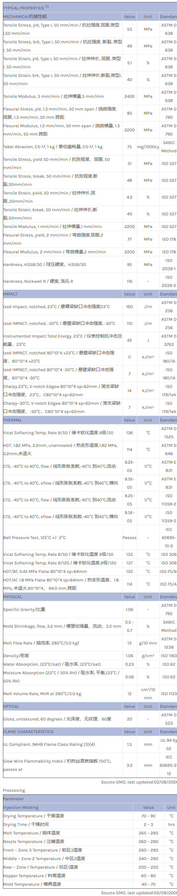 应用范围:产品描述NORYL PPO FXN119LG物性表Noryl FXN119LG is a low gloss PPE/HIPS grade. It provides a balance of MECHANICAL机械性能 properties and heat performance with intrinsic low gloss appreance. FXN119LG is available