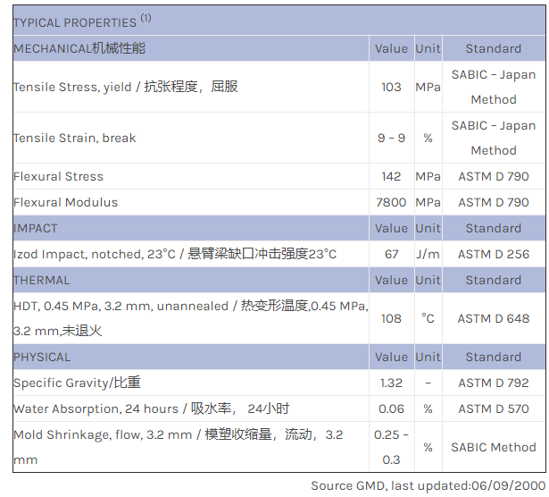 应用范围:产品描述NORYL PPO HFM3020H物性表