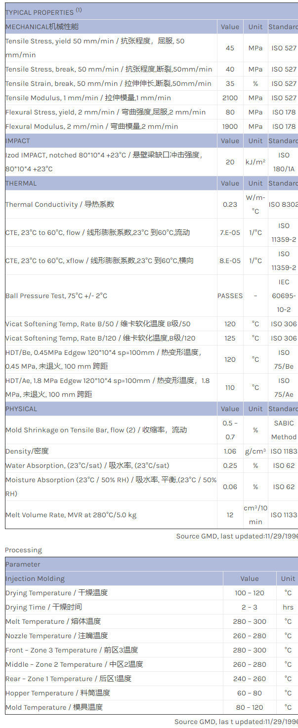 应用范围:产品描述NORYL PPO IN120Y物性表NORYL IN120Y is an easy flow, impact modified and medium heat resistant grade.